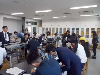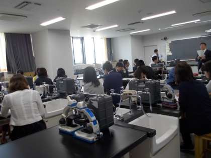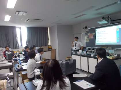 授業改善における理科の実技研修と算数と数学のつながりの課題についての学習会を中学校の理科室で行いました。