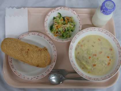 献立 きなこ揚げパン コーンチャウダー ツナサラダ 牛乳