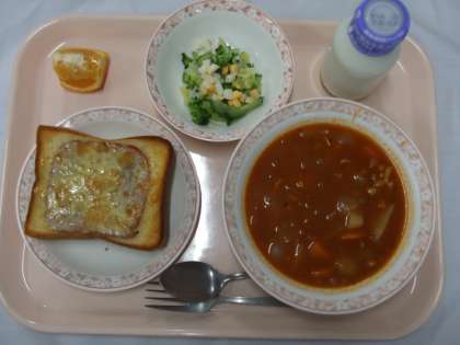 献立 ハムチーズトースト ビーンズシチュー グリーンサラダ 甘夏 牛乳