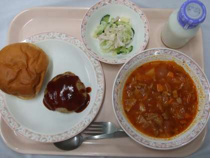 6月26日(月曜日)の給食 公開日 2017/06/26 更新日 2017/06/26 給食・食育 献立 セルフハンバーガー(ミルクパン、ハンバーグ) ミネストローネ イタリアンサラダ 牛乳 いいね(0)