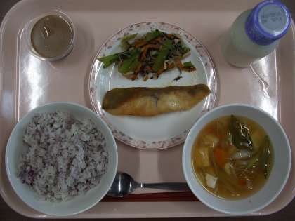 献立 ゆかりごはん 吉野汁 めだいの西京焼き 小松菜サラダ カフェオレゼリー 牛乳