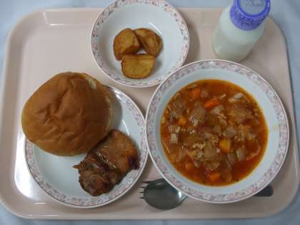 献立 セルフ照り焼きチキンバーガー ABCトマトスープ スパイシーポテト 牛乳