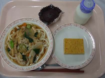 献立 五目うどん 千草焼き おはぎ 牛乳