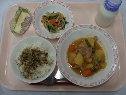 献立 ごはん じゃこふりかけ 肉じゃが ツナ入りゴマ和え りんご 牛乳