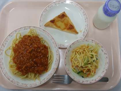 献立 スパゲッティミートソース じゃがいものハニーサラダ アップルパイ 牛乳
