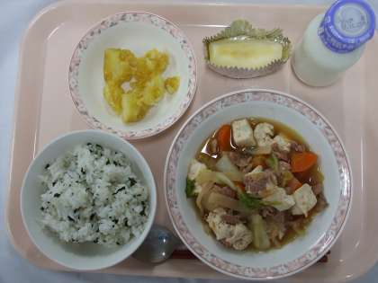 献立 わかめごはん 肉豆腐 粉ふきいも(カレー味) りんご 牛乳
