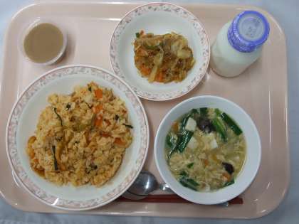 献立 キムチチャーハン ニラ玉スープ チャプチェ カフェオレゼリー 牛乳