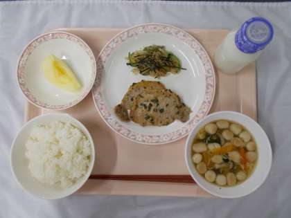 献立 ・ご飯 ・豚肉の香味焼き ・和風サラダ ・すまし汁(卵、麩) ・りんご ・牛乳