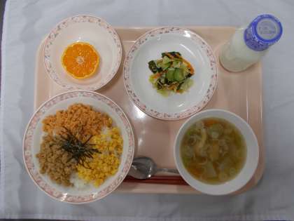 献立 ・三色そぼろ丼 ・カリカリじゃこサラダ ・のっぺい汁 ・みかん ・牛乳