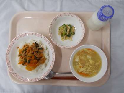 献立 ・豚キムチ丼 ・和風大根サラダ ・卵スープ ・牛乳
