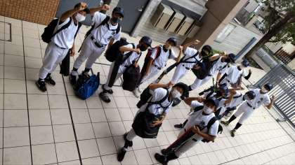 雨による順延を防ぐため、野球部は本日午後から公式戦へ向かいました
