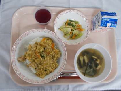 親子丼 味噌汁 たくあん和え ぶどうゼリー 牛乳