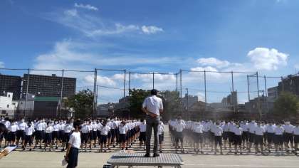風が強く、日差しも厳しい中でしたが、第一回目の運動会全体練習が実施されました