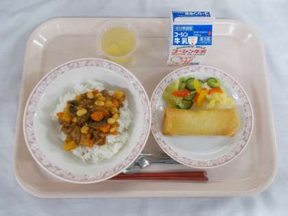 チリコンカンライス ポテサラ春巻き パプリカサラダ アップルゼリー 牛乳