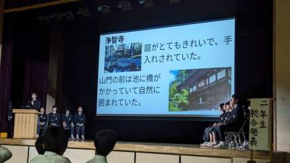 学習発表会 2年生発表その2 公開日 2023/10/28 更新日 2023/10/28 学校・学年行事 B組とC組の発表では名刹が続きました 長谷寺や円覚寺、浄智寺、銭新井弁天などの外せないスポットが続きました スクリーンを見る1年生の目がキラキラしていたのは、映像の反射だけではなかったはずです 来年度の校外学習の素敵な参考になったことでしょう いいね(0)