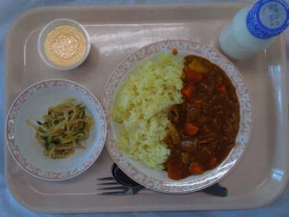 今日の献立 ターメリックライス・ポークカレー・もやしときゅうりの胡麻風味和え・プリン・牛乳