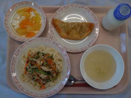 鶏肉のピリ辛冷麺風・かぼちゃのサモサ・杏仁豆腐・牛乳