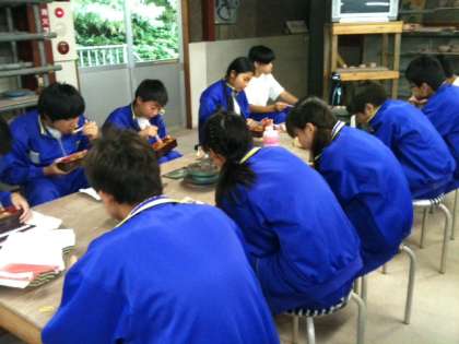 月夜野焼の工房内で、食べています。