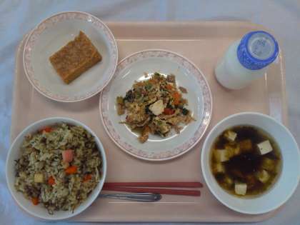 7月10日の給食 公開日 2012/07/10 更新日 2012/07/10 給食・食育 今日の献立 くふぁじゅーしー・ゴーヤチャンプルー・アーサ汁・黒糖蒸しパン・牛乳 今日は沖縄献立です。 くふぁじゅーしーとは、沖縄の混ぜご飯のことで、今日は豚肉・にんじん・かまぼこ・切り昆布が入っています。 白米に少量のもち米が混ぜてあるのでもちもちした食感もあります。 いいね(0)