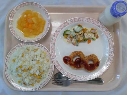 今日の献立 コーンピラフ・イカのリング揚げ・かぼちゃサラダ・フルーツポンチ・牛乳