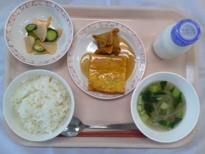 今日の献立 ご飯・スープ・芙蓉蟹・揚げワンタン・ピリ辛漬け・牛乳
