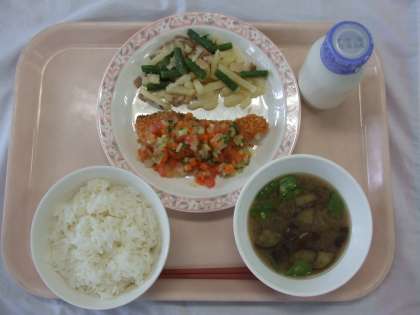 今日の献立 ご飯・味噌汁・鮭のラビゴットソース・じゃが芋のソテー・牛乳