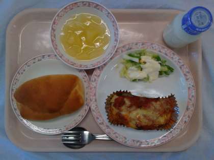 献立 ダイスチーズパン ポテトのミートグラタン グリーンサラダ アップルゼリー 牛乳