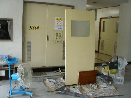 ドアがなくては不便なので、速く乾かすために扇風機を使って作業しています。
