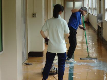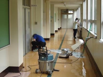 洗剤をまき、ポリッシャーで汚れを落とし、よく拭き取ってからワックスをかけます。2人で長い廊下を作業するので大変です。