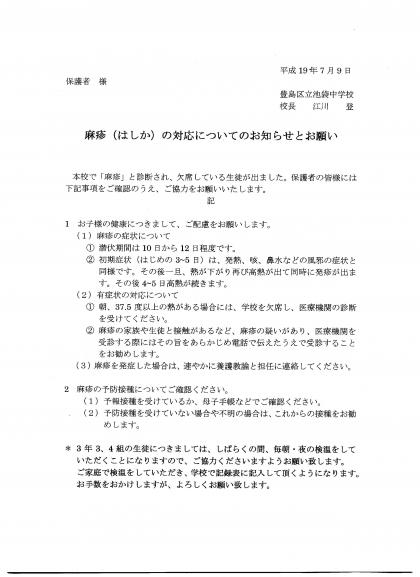 本校で、麻疹(はしか)と診断された生徒がおります。