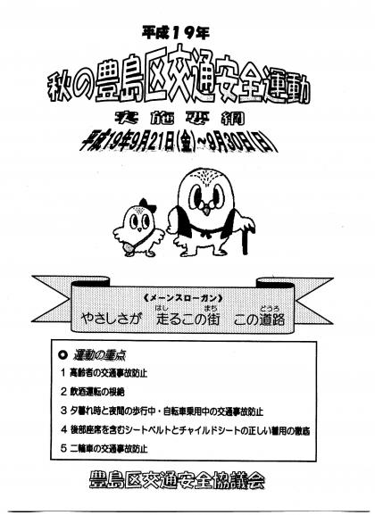 平成19年度「秋の豊島区交通安全運動」が、平成19年9月21日(金)〜9月30日(日)で実施されます。これを機に、交通安全についてより考え、交通安全を実行しましょう。