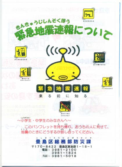 豊島区総務部防災課からの『緊急地震速報について』のリーフレットを「配布文書」に掲載しておきます。ご覧ください。