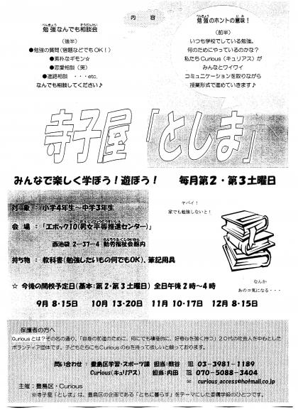 寺子屋「としま」 公開日 2007/09/13 更新日 2007/09/13 お知らせ 《寺子屋「としま」》 豊島区文化商工部学習・スポーツ課より学校へポスターが届きましたので、紹介させていただきます。(配布文書にPDFファイルで掲載してあります) いいね(0)