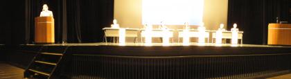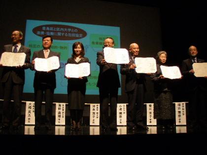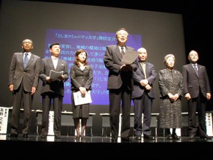 第2部は調印式典です。各学長からの地域連携メッセージと協定の締結です。その後、「としまコミュニティ大学」開校宣言が高野区長から声たからかに行われました。