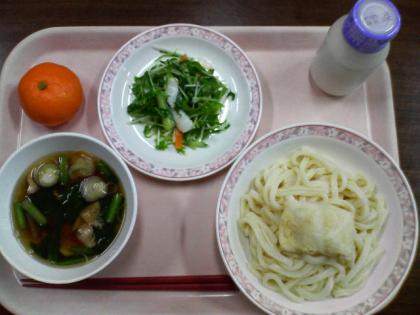 本日より、3学期の給食が始まりました。 <1月9日> 力うどん いかと水菜のサラダ みかん 牛乳