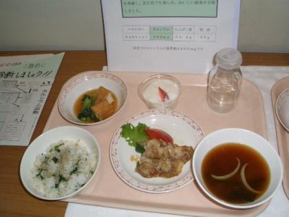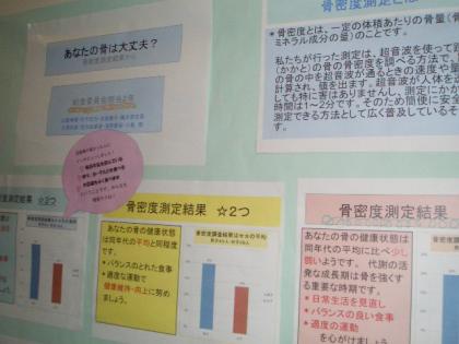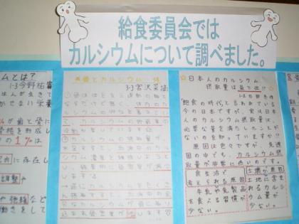 給食委員会の発表です。カルシウム摂取について発表されています。生徒が作った献立3種類も展示されています。見本食は、栄養士の川崎先生が今朝作ってきました。