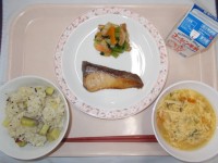 ~旬の食材を食べよう~ 金時おこわ ブリの照り焼き おひたし かきたま汁 牛乳