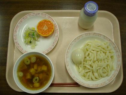 <12月13日 上段> けんちんうどん 味つけたまご キャベツの浅漬 みかん 牛...