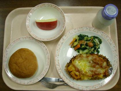 <12月18日 上段> 胚芽パン ラザニアグラタン ほうれん草ソティ りんご 牛...