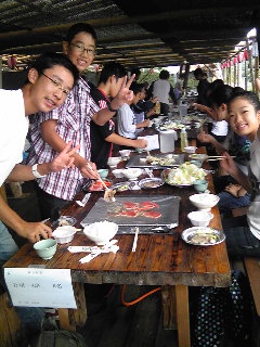 原田農園でバーベキューをしています。お肉を前に楽しそうです。