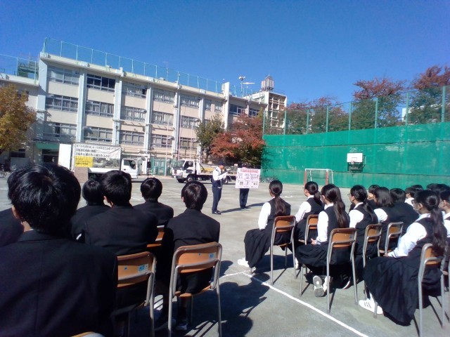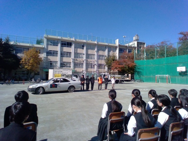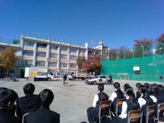 今日は、定期考査3日目でした。英語、美術、保健体育の3教科の試験が終わったあと、交通安全意識を高めるために「スケアード・ストレイト教室」を実施しました。まず、巣鴨警察の方から自転車安全利用五則についてわかり易く説明を受けました。次にシャドウ・スタントプロダクションの皆さんによる交通事故の再現の実演では、自転車事故や交差点での危険場面を目の当たりにして、生徒たちはその迫力に息をのんでいました。今回の学びを日頃の登下校や生活に活かしていきましょう。