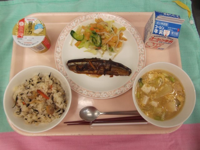 さんまは、給食室の大きな鍋で2時間半程煮て作りました。鍋に昆布、さんま、しょうが・にんにく、だし汁、調味液の順に重ねて、じっくり煮るため、さんまに味が染み込み、骨までやわらかくなっています。骨ごと食べられるのでカルシウムをとることができます。
