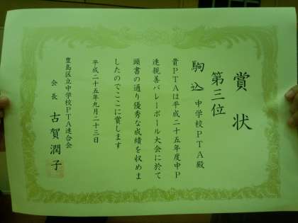 9/23(月)豊島区中学校PTA連合会主催の親善バレーボール大会が開催されました。例年行われている大会も年々レベルが上がり、各校とも簡単に得点を許さない白熱したシーソーゲームの連続で、当初の予定時間を大幅に延伸してしまいました。そのため、最後の優勝決定戦と表彰式は、10/8(火)に執り行われました。