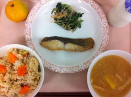 今日は秋を感じられる献立になっています。秋の山路ご飯には、栗・揚げ・しめじ・にんじんが入っています。栗はご飯と一緒に炊き込んでいます。にんじんは、給食室で型抜きをして「もみじ型」にしてのせました。「もみじがかわいい!」というコメントをくれました。みかんも今年初めてでしたが、甘くておいしいみかんが届けられました。