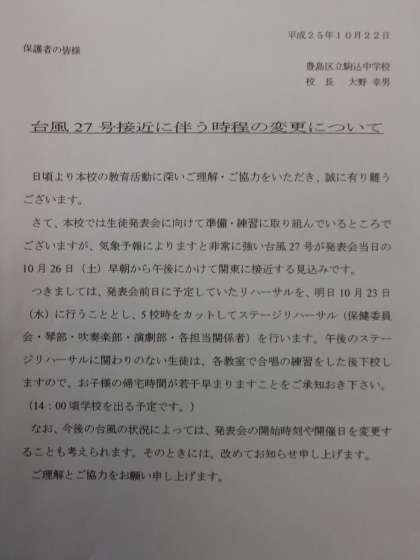 明日の時程の変更について 公開日 2013/10/22 更新日 2013/10/22 学校より 10/23(水)の時程の変更をいたします。プリント(写真参照)でもお知らせしましたが、台風27号の接近に伴い、生徒発表会のリハーサルを明日行うことにいたしました。リハーサルの終了時間は18:30です。また、リハーサルに関わりのない生徒は14:00頃学校を出る予定です。 いいね(0)