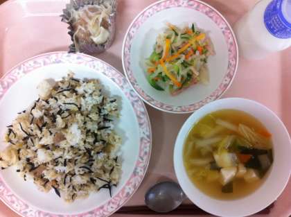 10月29日(火)の給食 公開日 2013/10/29 更新日 2013/10/29 給食 ひじきチャーハン ジャンボシュウマイ 大根サラダ 中華スープ 牛乳 今日は給食室で手作りのジャンボシュウマイを作りました。豚ひき肉をよくこね、玉ねぎ、しょうが、調味料を混ぜます。皮は特注の11センチの大きさのものを注文し、260ヶのシュウマイを1つずつ包みました。 いいね(0)