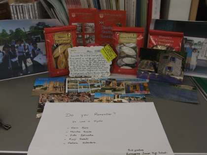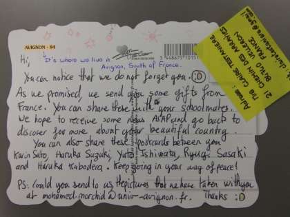 9月の修学旅行(in 京都)において、外国人観光客にインタビューをしたところですが、ある班はフランスから来られた方と親交を深め、そのときに約束したということで、なんと、フランス(Claire Testaniere さん)から小包が届きました。中には、5人の生徒宛てに手紙と写真に加えてお菓子が入っていました。うれしい驚きでした。