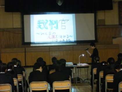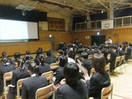 1年生の代表9名が、「総合的な学習の時間」において取り組んだ「職業について調べた結果」を発表しました。各々、興味・関心のある職業について、フリップを工夫し堂々と発表しました。