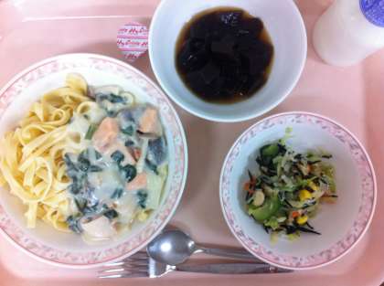 11月12日(火)の給食 公開日 2013/11/12 更新日 2013/11/12 給食 秋鮭ときのこのクリームスパゲティ ひじきと豆のサラダ コーヒーゼリー 牛乳 今日のスパゲティとサラダは、3年生考案のカルシウムたっぷりメニューです。 スパゲティはクリームソースに牛乳が入り、また一緒に入った鮭にはビタミンDが含有しているためカルシウムの吸収率がアップします。サラダには、カルシウム豊富なひじきと大豆が入っています。とても工夫して考えてくれました。 いいね(0)