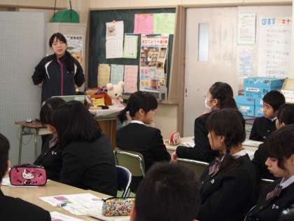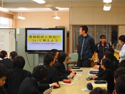 11月11日(月)1校時に2年B組、14日(木)1校時に2年A組、保健体育の「運動と健康」「食生活と健康」の単元で骨の役割や骨粗鬆症やその予防について学習しました。体育科の小林教諭・佐々木主任養護教諭・武田栄養士のTTで行われました。
